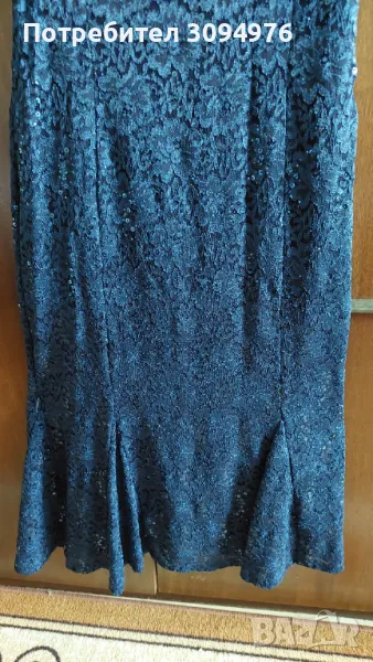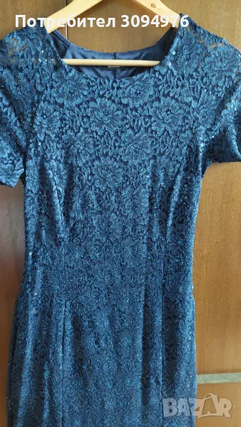 Дамска официална рокля тъмносиня от нежна дантела с подплата. Цялата рокля е с паиети в същия цвят. Модела е по тялото с вмъкнати триъгълници в долната част.