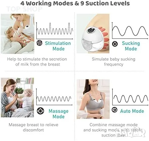 Универсални режими и нива на засмукване: Носещата се помпа за кърма предлага 4 режима: Автоматичен режим, режим на масаж, режим на стимулация и режим на изсмукване, всеки с 9 регулируеми нива на засмукване. Имате пълен контрол върху изпомпването и тя се изключва автоматично след 20 минути. Можете също така да поставите помпата за кърма на пауза по всяко време. Освен това тя разполага с функция за памет, която запомня предпочитания от вас режим на работа и ниво на засмукване.