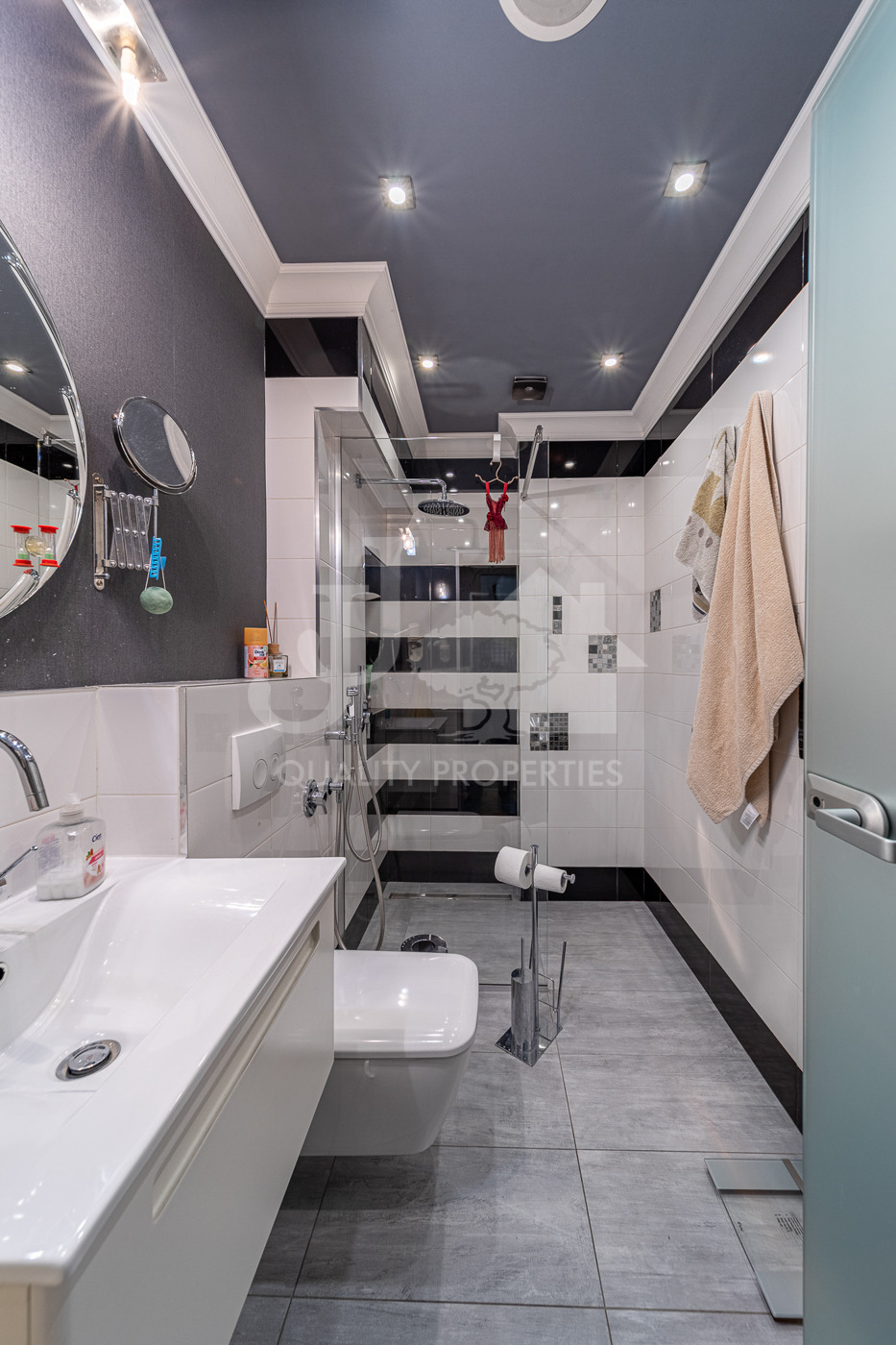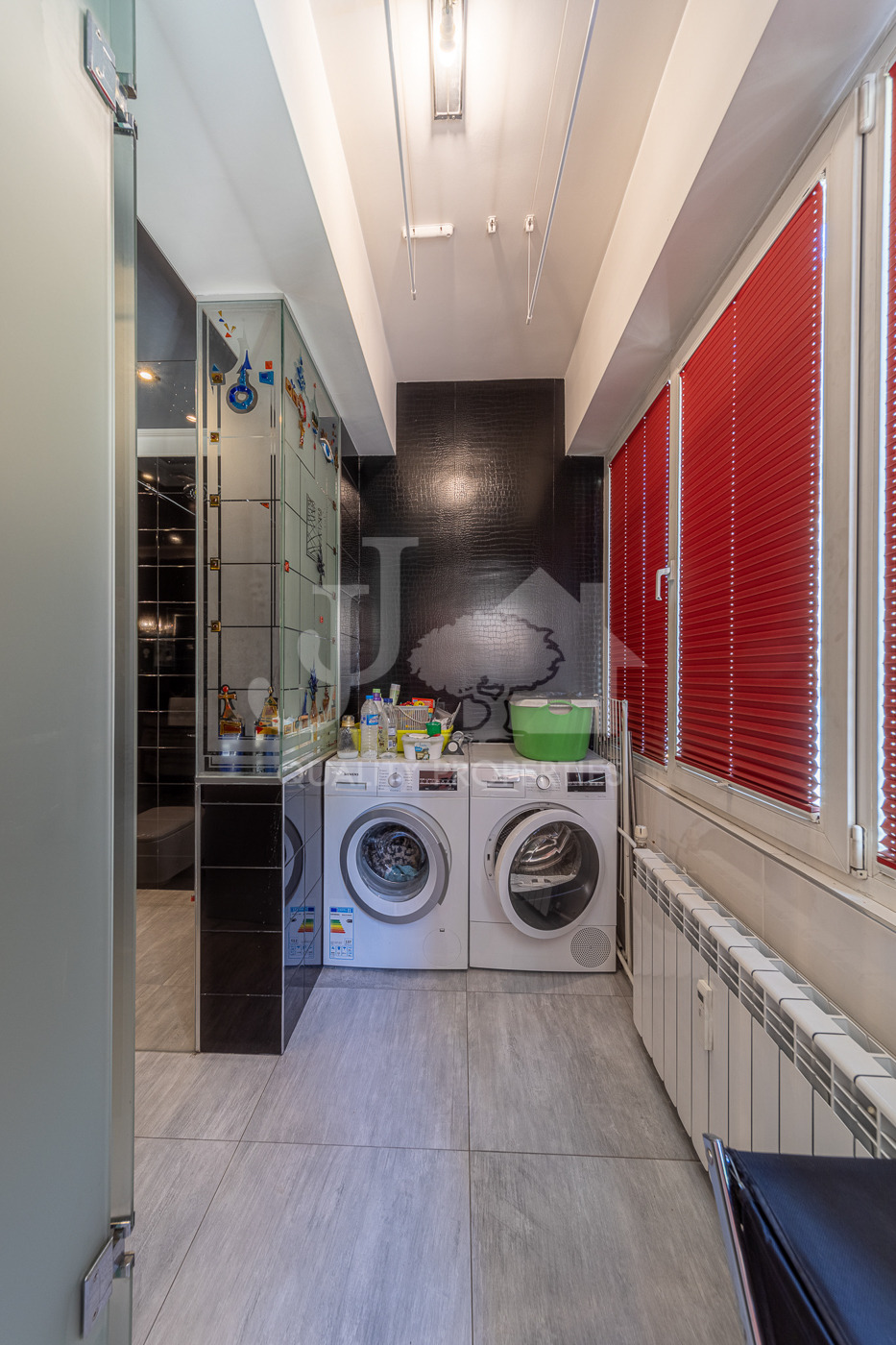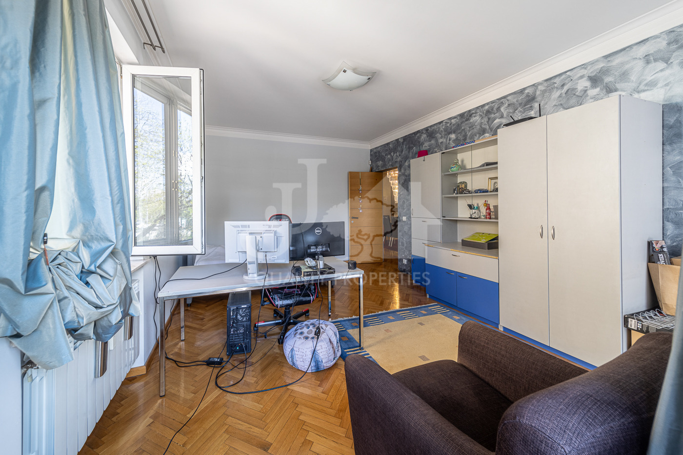 Великолепната сграда, в която се намира апартамента е с отлични общи части, асансьор и с контрол на достъпа. Апартаментът е разположен на етаж втори над партер, с площ от 188 кв.м, изключително слънчев, просторен и позволяващ различни варианти на преустройство. Разпределение: входно антре, двоен хол с отделно помещение за кухня към него, три спални, две бани с тоалетни, отделна тоалетна, два балкона и други сервизни помещения. Изложението на жилището е юг/север, а отоплението е на ТЕЦ. Към апартамента има мазе 20 кв.м и паркомясто в двора включени в цената.