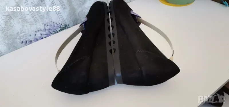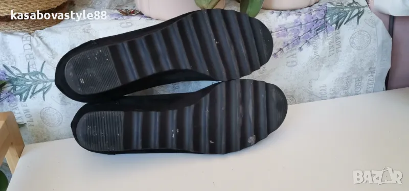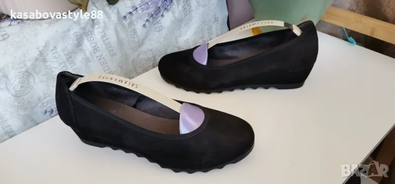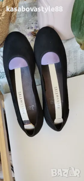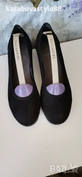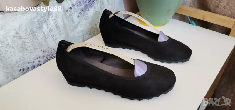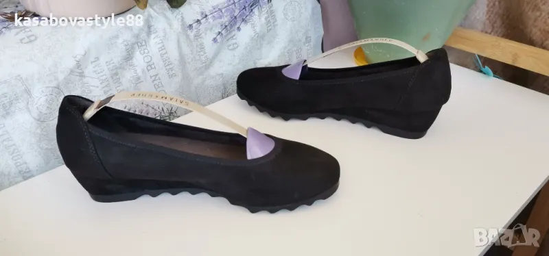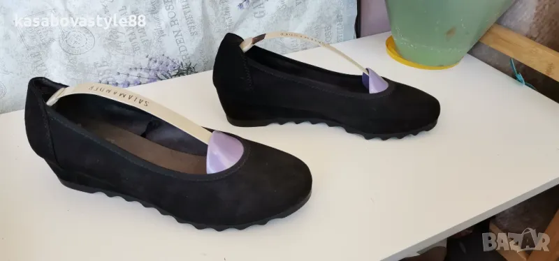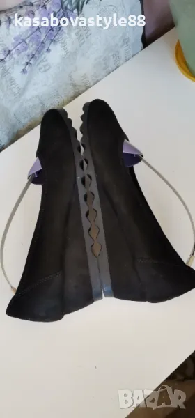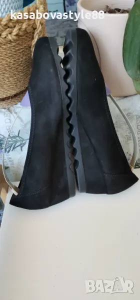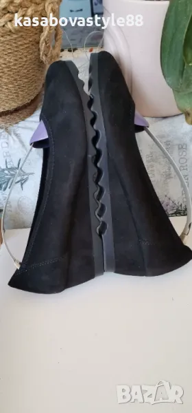 Висококачествени, ултра леки и много комфортни дамски обувки за ежедневието и за официални поводи. Изработени от естествен велур в черен цвят. Вътрешна част-естествена кожа и много мека стелка от естествена кожа.Те осигуряват пълна опора и перфектна гъвкавост при движение. Дължина на стелка 26.2см.Ходило-4.5см.Цялостна височина отзад 11.3см.