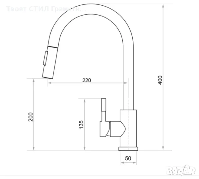 Технически чертеж на Смесител с Изтегляща се Глава/Чучур модел 9600