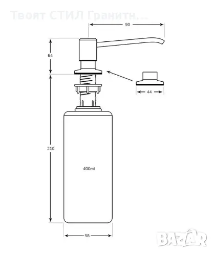 Дозаторът за течности за мивка е елегантно и функционално допълнение, което ще внесе ред и естетика във вашата кухня. Перфектно съчетана с гранитни мивки, полимерни, композитни и други, той се превръща в незаменим елемент в зоната за миене. Благодарение на монтажа в корпуса на мивката, в предварително подготвен отвор с диаметър 35 mm, дозаторът хармонично се вписва в околната среда, добавяйки елегантен завършек.