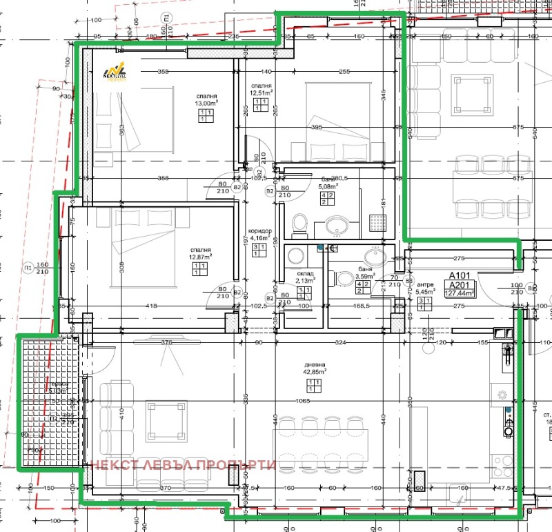 Агенция 'НЕКСТ ЛЕВЪЛ ПРОПЪРТИ' предлага на Вашето внимание четиристаен апартамент със следното разпределение: Антре, дневна с трапезария и кухненси бокс, три спални, две бани с тоалетна, склад/мокро помещение и тераса.