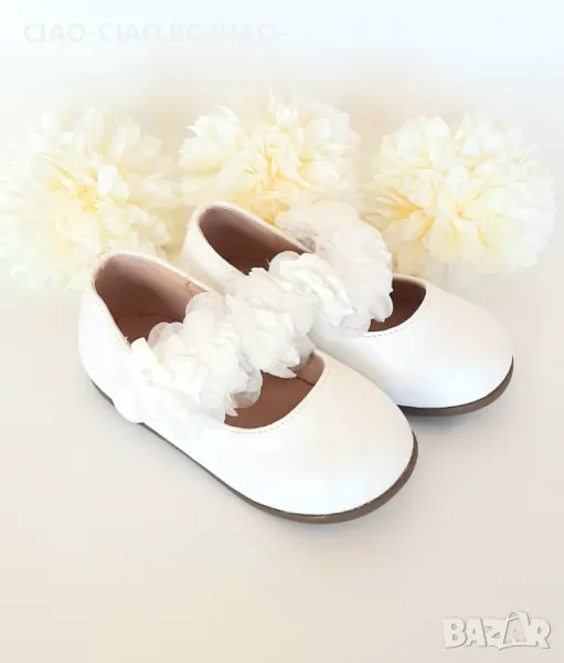 БЕЛИ БАЛЕРИНКИ за момиче с бели цветя и перлички BUBBLE KIDS
