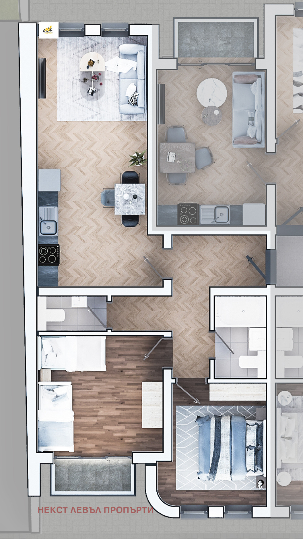 Агенция Некст Левъл Пропърти предлага на Вашето внимание тристаен апартамент от доказан строител в комплекс със следното разпределение: антре, кухненски бокс с трапезария, две спални, баня с тоалетна, допълнителна тоалетна и тераса.