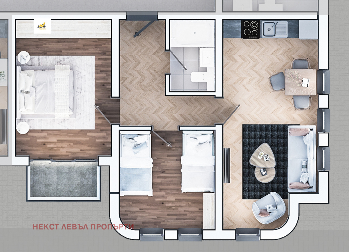 Агенция Некст Левъл Пропърти предлага на Вашето внимание тристаен апартамент от доказан строител в комплекс със следното разпределение: антре, кухненски бокс с трапезария, две спални, баня с тоалетна и тераса.
