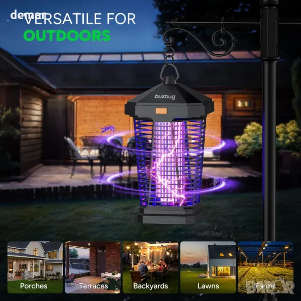 Това устройство с двойно предназначение съчетава мощен контрол на насекоми с енергийно ефективно LED осветление, използващо усъвършенствана двубандова UV технология (365nm + 395nm), идеално за открити пространства като вътрешни дворове и градини. Разполага с високоволтова мрежа от 3800V за ефективно елиминиране на комари, със защитен капак, безопасен за деца и домашни любимци. 12W лампата консумира значително по-малко енергия от традиционните лампи, включва дълготрайни LED мъниста с живот до 10 години. Изградено с водоустойчив огнеупорен корпус IPX4 и 2-метров захранващ кабел, то е подходящо за различни външни условия. Устройството покрива над 195 кв. м и предлага лесно превключване между контрол на комарите и топло осветление.