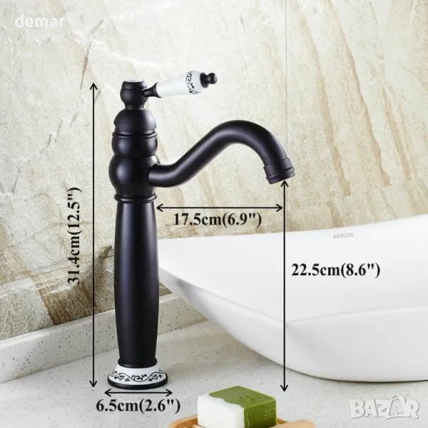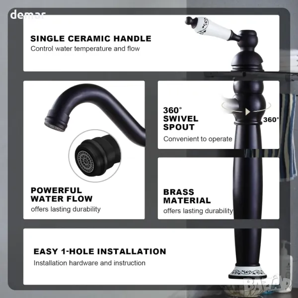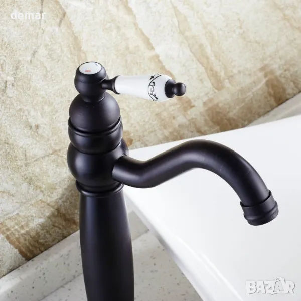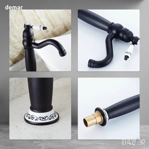 Изработен от издръжлив месинг и керамика, този смесител с черно покритие се отличава с винтидж дизайн, който е подходящ за бани, тоалетни, кухни и други. Гъвкавият му чучур позволява лесно почистване около мивката, а единичната керамична дръжка осигурява плавен контрол на температурата и дебита на водата. Комплектът включва стандартни маркучи, монтажни елементи и инструкции за лесен самостоятелен монтаж.
