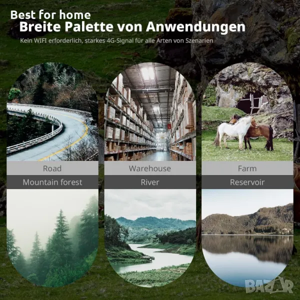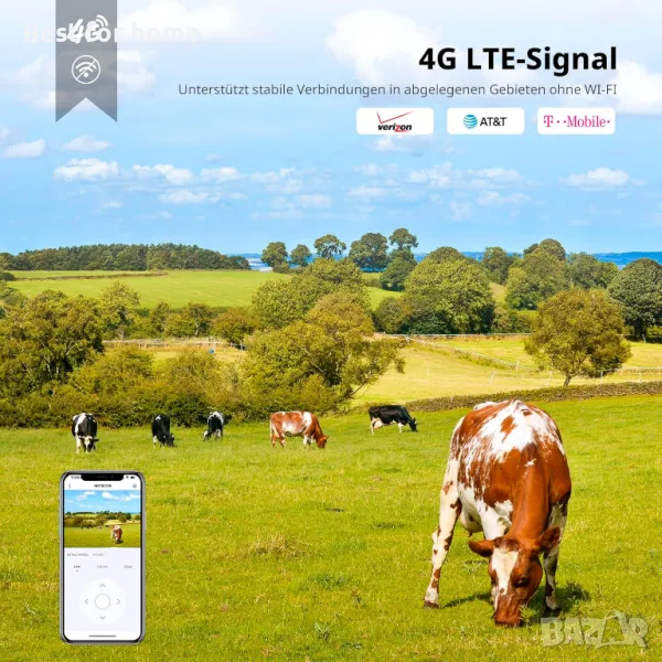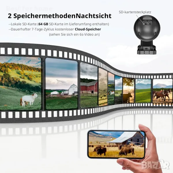 100M SIM карта/64G SD карта/Съхранение в облак: Тази безжична охранителна камера поддържа 4G мрежи Verizon, T-Mobile и AT&T и се предлага с 64GB SD карта (поддържа до 128GB) и предплатена 4G LTE SIM карта за безплатен пробен период от 100MB данни. След изтичане на пробния период можете да закупите допълнителни планове за данни в приложението на по-ниска цена. Можете да използвате SD карта или услуга за съхранение в облак за съхранение на видео.