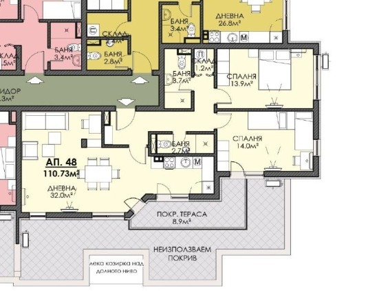 Имотът е ситуиран на 6ти жилищен етаж с обща площ от 110.73 кв.м. разгърната в следното разпределение: