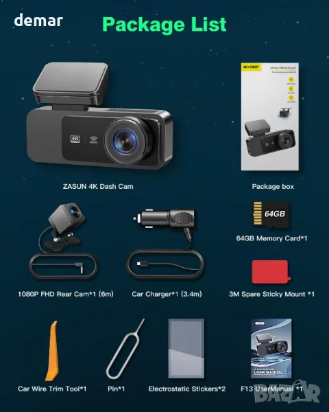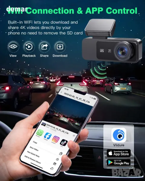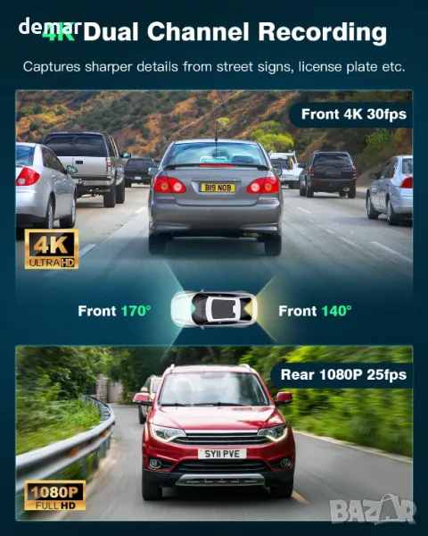Тази двойна видеорегистраторна камера предлага ултра ясен 4K преден и 1080P заден запис с широкоъгълно покритие, заснемайки важни детайли като регистрационни номера и знаци в до шест ленти. Тя разполага с WiFi свързаност за преглед в реално време, лесно споделяне чрез специално приложение и удобни актуализации на фърмуера. Цикличният запис и откриването на удар гарантират, че ключовите моменти ще бъдат запазени, с включена безплатна 64GB карта и поддръжка за по-голямо място за съхранение. Подобреното нощно виждане с WDR и 6-слоен обектив осигурява резки кадри при всякаква светлина. 24/7 режимът за паркиране, активиран от комплект за свързване (не е включен), осигурява непрекъсната защита, дори когато автомобилът е изключен.