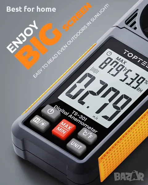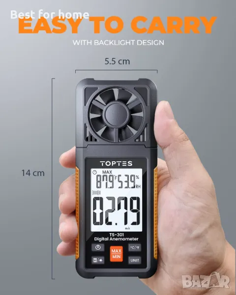 TS-301 Анемометър Измервател на скоростта на вятъра, 2,26-инчов дисплей Ветромер с подсветка, Макс/Минимум/Средно - оранжев