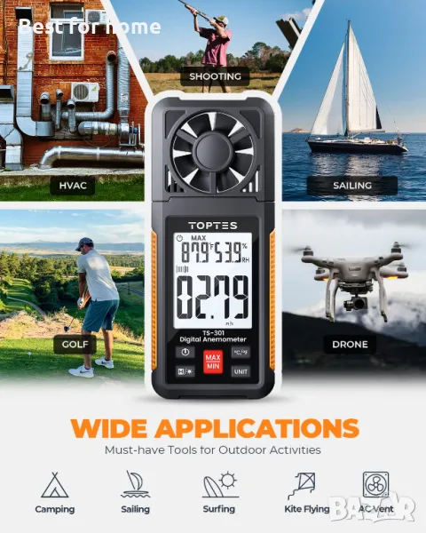 Лесен за четене с 2,26-инчов LCD екран с подсветка: Анемометърът TopTes разполага с голям 2,26" LCD екран за лесно отчитане. Този ръчен ветромер е идеален за дейности на открито като ветроходство, уиндсърфинг, летене с дрон, пускане на хвърчила, каране на лодка, фризби, голф, стрелба и други. Използвайте го, за да определите местните метеорологични условия и да оцените потенциалното въздействие на скоростта на вятъра върху вашите дейности