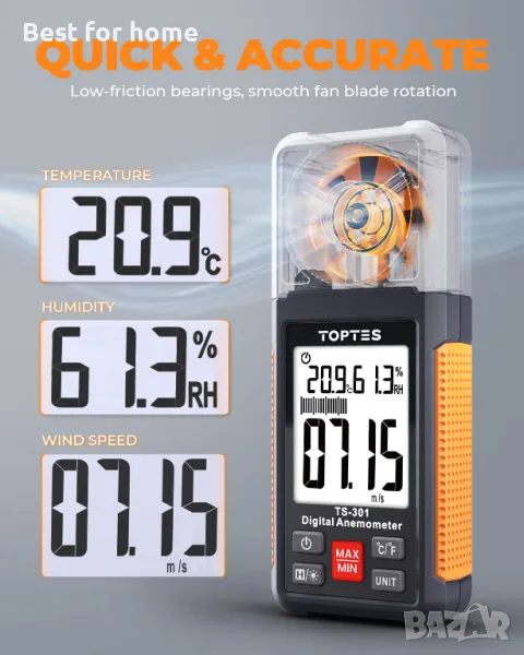 Анемометър с 6 измервателни единици: Това устройство за измерване на скоростта на вятъра е оборудвано с лесно въртящи се перки на вентилатора и измерва скоростта на вятъра в 6 единици: футове в минута (ft/m), футове в секунда (ft/s), мили в час (mph), възли (възли), километри в час (km/h), метри в секунда (m/s) Стойност на скоростта на вятъра x10. Използвайте го, за да оцените вътрешния въздушен поток в настройки като HVAC, вентилационни отвори, колектори за прах, топлинни регистри
