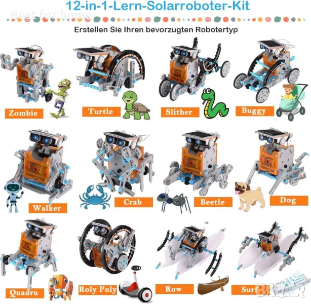 Комплект соларен робот 12 в 1: соларната играчка STEM може да се монтира в 12 различни типа роботи и да се движи по суша или във вода. Нашият комплект соларен робот съдържа 190 части и вашите деца могат да следват инструкциите, за да изградят свои собствени роботи стъпка по стъпка и да играят с тях в много ситуации.