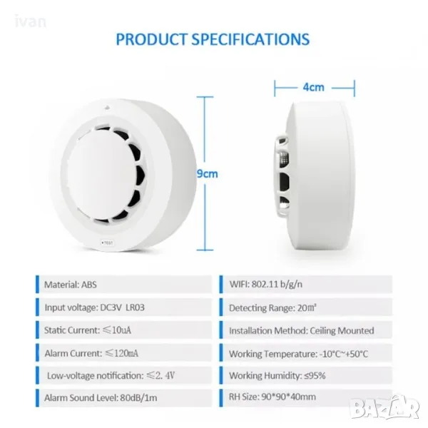 Интелигентен детектор за дим, съвместим с приложенията TuyaSmart и SmartLife, температура и влажност, хигрометър, WiFi, телефонно предупреждение, 80 db, противопожарна защита, аларма за дома и други пространства, бял