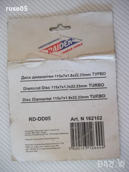 Диамантен диск Raider RD-DD05 Turbo е с диаметър на диска 115 мм и вътрешен диаметър 22 мм. Използва се за рязане на порцелан , гранит и други твърди , плътни материали . Предназначен е за сухо или мокро рязане . Със сегментна структура , която поддържа острието охладено . Разполага с тънък сегмент за бързо нарязване и охлаждащи отвори , които предпазват от повреда при прегряване .