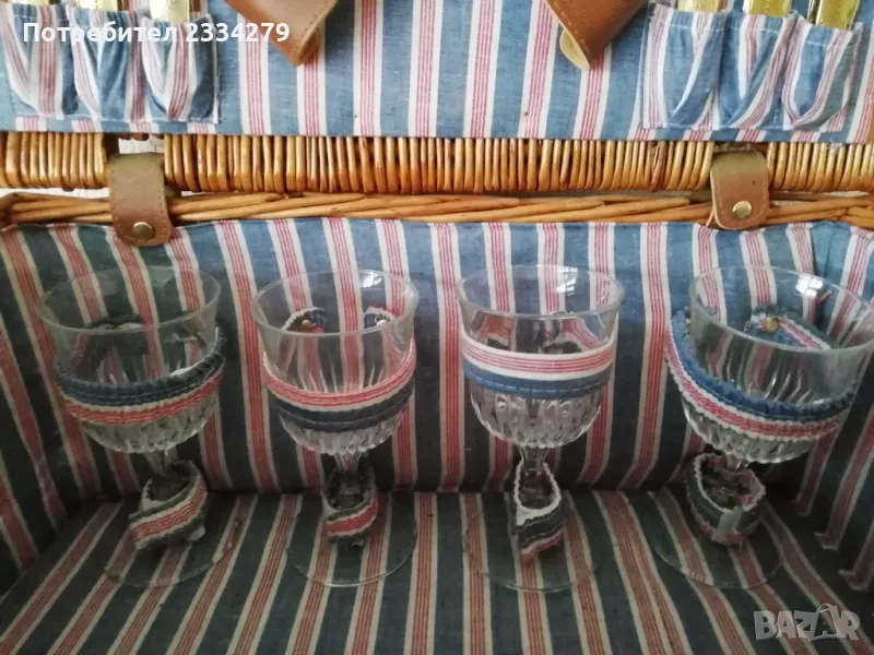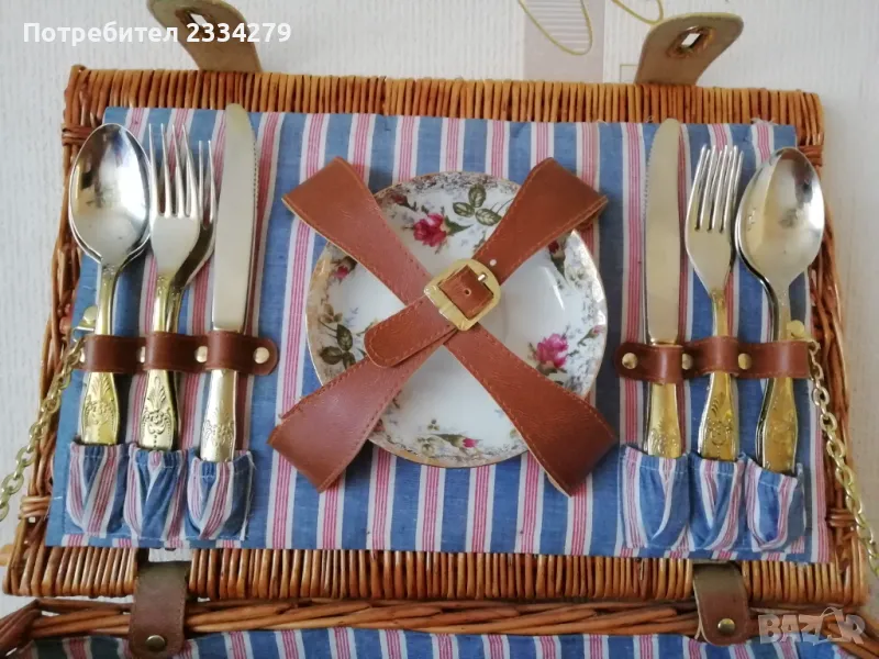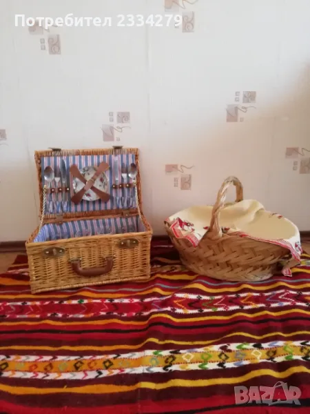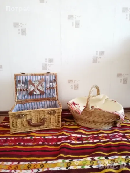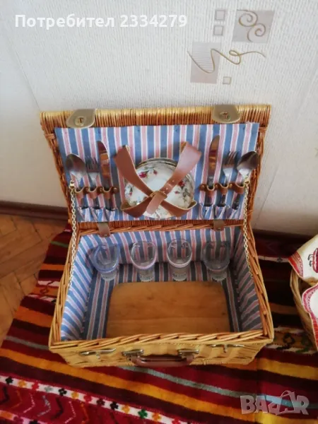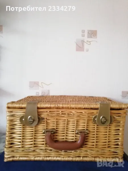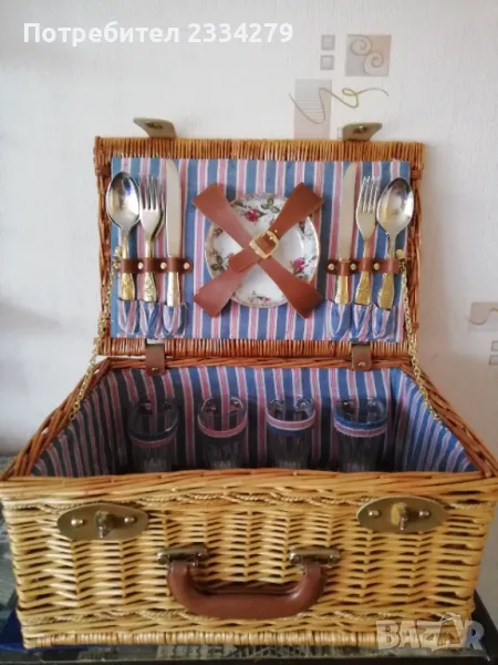Стар ратанов много добре запазен куфар за пикник, риболов, туризъм и други. Ръчно изработен, изплетен от ракита и шит плат, размери 45х30х21см. Приборите са за 4 човека, ножове, вилици, лъжици, 4 чинии и чаши, дъска за рязане, цена 80лв.;