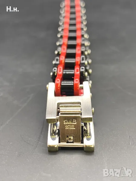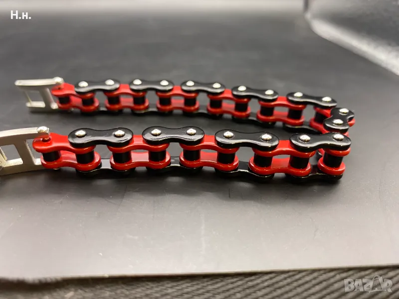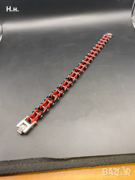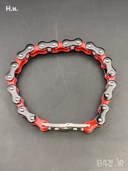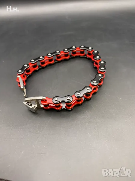 Представяме ви стилна и здрава мотористка гривна, изработена с внимание към детайлите! С уникалния си дизайн тип верига, комбиниращ червени и черни елементи, тази гривна е перфектният аксесоар за всеки почитател на мотоспорта и адреналина.