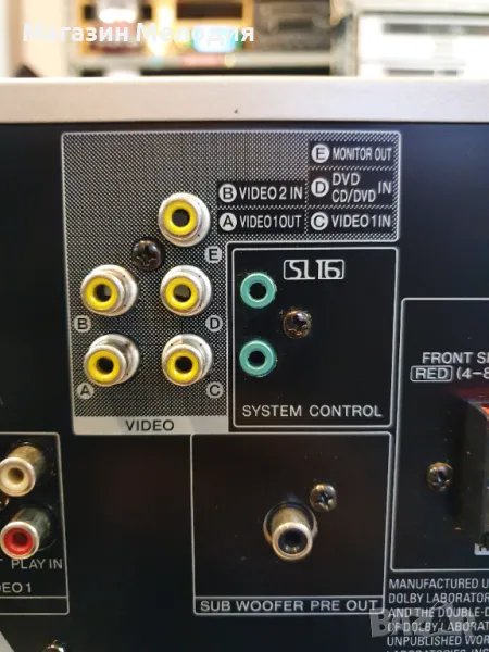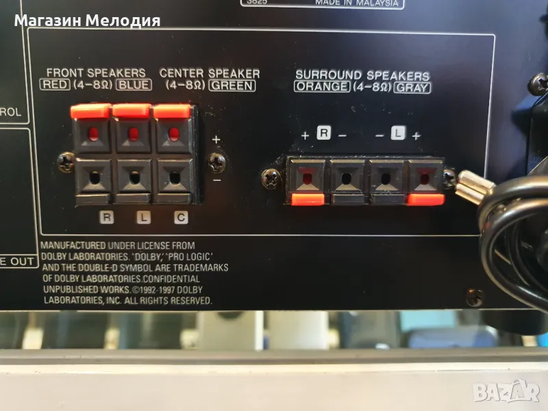 Спецификации : Диапазон на настройка: FM, MW. Изходна мощност: 80 вата на канал в 4Ω (стерео). Съраунд изход: 80 W (отпред), 80 W (център), 80 W (отзад).