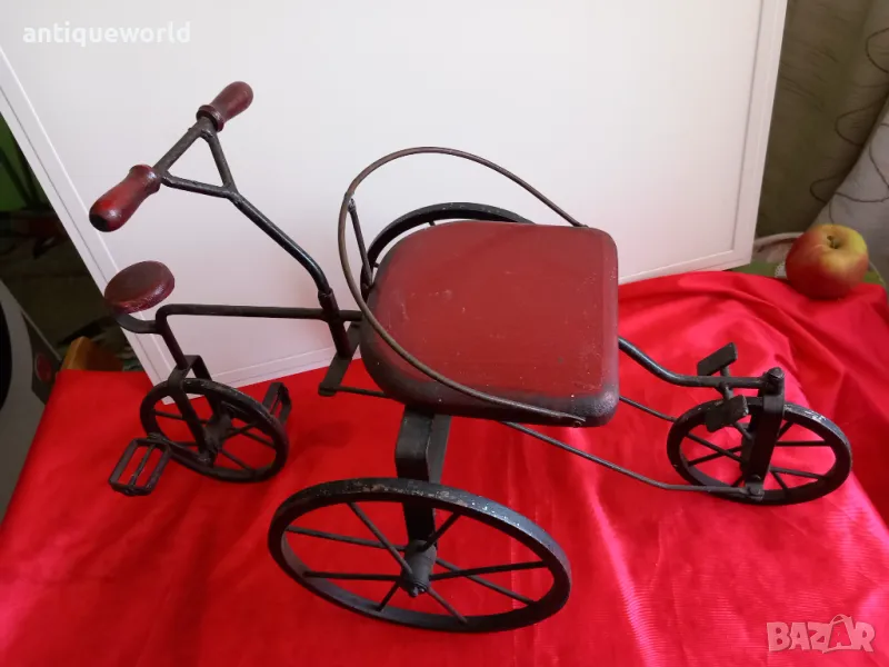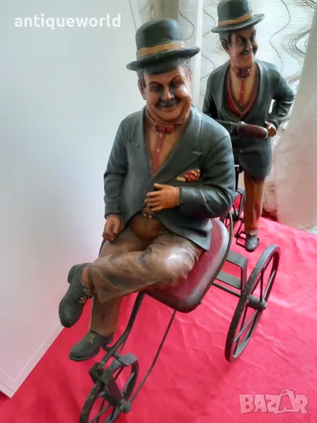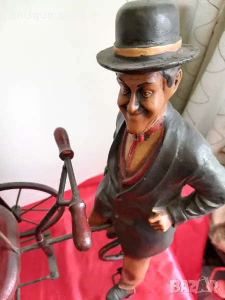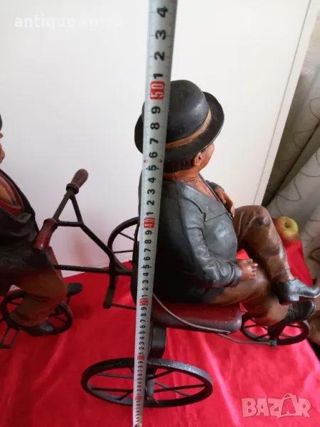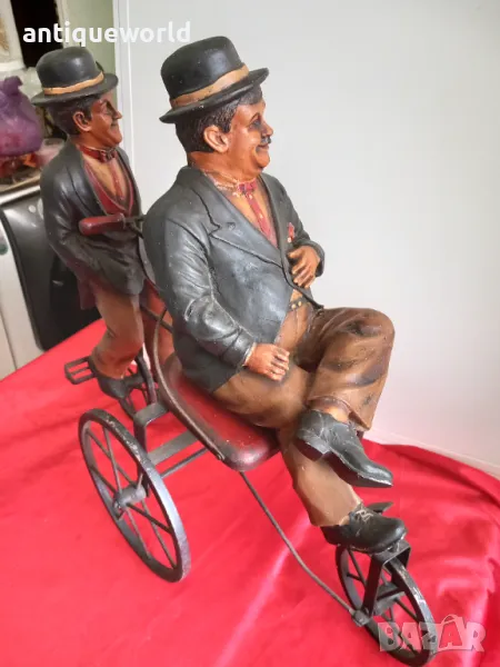 Рядка Много Красива Стара Масивна Винтидж Композиция Лоуръл и Харди на Колело. Голяма Фигура ,Статуя , Фигури .Размери Височина 50см, Широчина 60см , Тегло 5кг! Колелото е Масивно , Метал и Дърво с Движещи се педали ,Фигурите може да се махат.