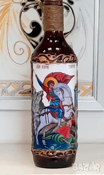 Комплект от авторска, ръчно изработена бутилка 0,750 л. с 2 бр. чаши за вино в оригинална дървена поставка с надпис "Наздраве".