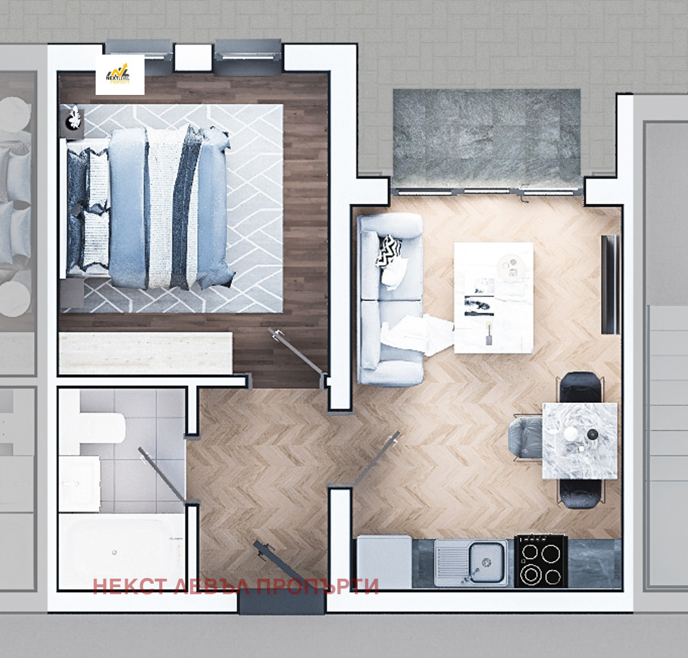 Агенция Некст Левъл Пропърти предлага на Вашето внимание двустаен апартамент от доказан строител в комплекс със следното разпределение: антре, кухненски бокс с трапезария, спалня, баня с тоалетна и тераса.