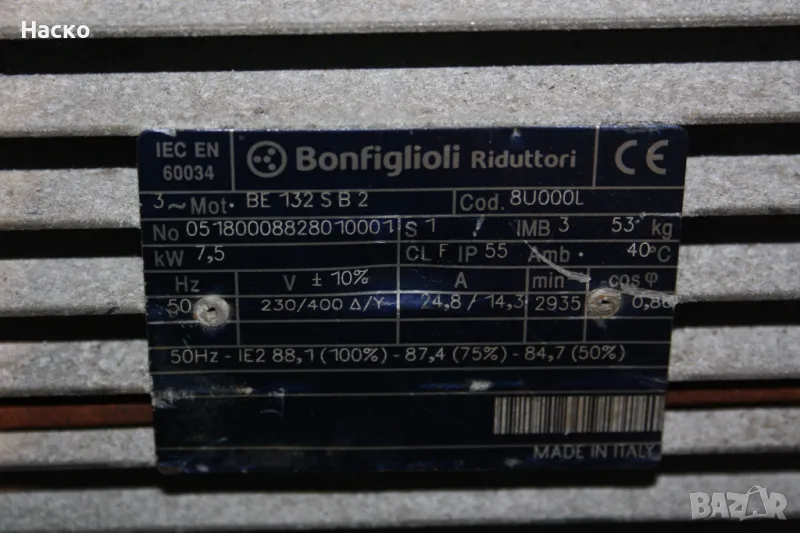 Продавам трифазен електромотор Bonfiglioli, модел BE 132 SB2. Отлично състояние, готов за употреба. Подходящ за индустриални машини, транспортьори и друго оборудване.