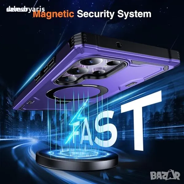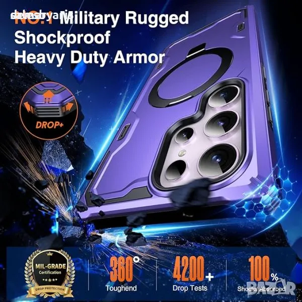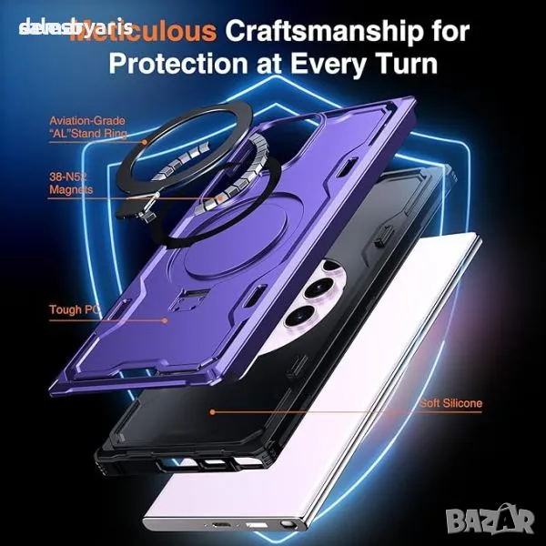 Защитния калъф MagAmor Samsung S24 Ultra, с удароустойчива броня от военен клас, проектирана да издържи 5 пъти повече изпускания. Вграденият авиационен алуминиев пръстен за стойка действа като магнитна стойка и държач за пръстени, което позволява гледане без ръце и стабилни селфита. Прецизно проектиран с повдигнати ръбове на камерата и екрана, той предпазва от драскотини и удари със здрави, грапави въздушни възглавници на ъглите.