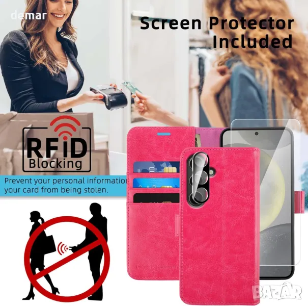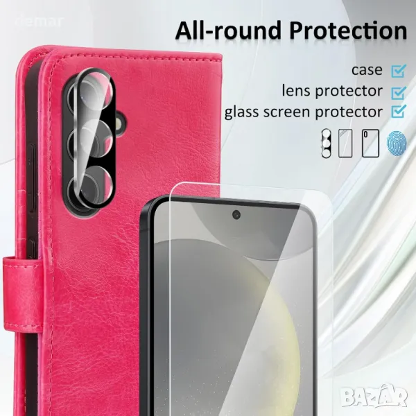 Проектиран за Samsung Galaxy S24 5G (6.2"), този кожен калъф-портфейл с флип фолио предлага място за три карти и до четири банкноти, включва протектори за екран и обектив за пълно покритие и разполага с вътрешен RFID блокиращ слой за сигурност. Изработен от издръжлива двуслойна изкуствена кожа, той е устойчив на разтягане, избледняване и повреди от пръски или падания, докато повдигнатите страни и 360° защитата помагат за предотвратяване на надраскване. Здраво магнитно закопчаване държи всичко сигурно, а многофункционалната стойка поддържа както хоризонтално, така и вертикално гледане за допълнително удобство.