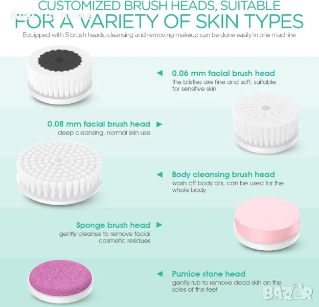 Комплект за почистване на лице и тяло - Снабден с 5 функционални глави за четки, сред които и четка за тяло. Тази въртяща се четка може да отговори на всички нужди за почистване на вашето лице и тяло.