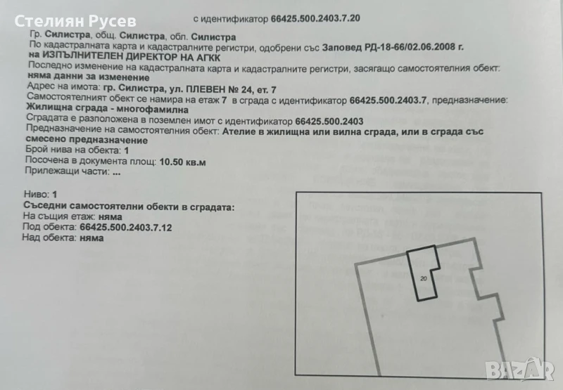 -СОБСТВЕНИК ПРОДАВА ,10.5кв помещение със собствен идентификатор , оценката на имота е 2710лв
