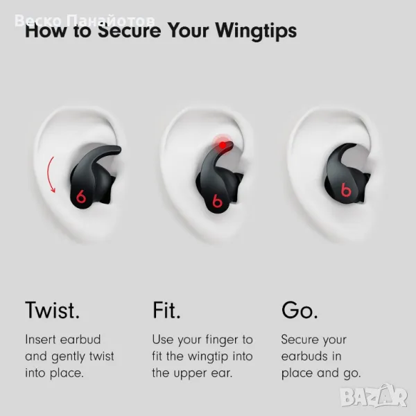 Слушалките Beats се доставят с три комплекта накрайници - малки, средни и големи. Средните наушници са прикрепени към продукта. Изберете чифта, който е най-удобен и осигурява най-доброто звуково изживяване за вас. За да изберете правилния накрайник за уши, първо внимателно поставете слушалката с прикрепен накрайник в ухото си. Можете да регулирате прилягането на слушалката, докато се почувства сигурно. За да извадите слушалката от ухото си, завъртете я внимателно и я издърпайте от ухото си. Гъвкавият накрайник на крилото е постоянно прикрепен към Beats Fit Pro и помага за стабилността на слушалката. Използвайте пръста си, за да огънете леко върха на крилото и да го поставите в горната част на ухото си. Накрайникът на крилото, комбиниран с правилния накрайник на ухото, ще осигури удобно и сигурно прилягане, което спомага за оптимизиране на звуковото представяне.
