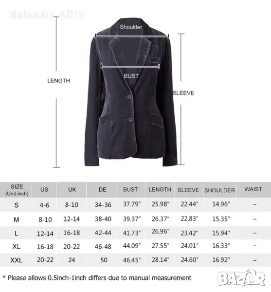 Това дамско кадифено сако със своя основен ревер и обърната яка предлага шик и изискан външен вид. Изработен от 95% полиестер и 5% еластан, той е едновременно удобен и лек, което го прави идеален за носене през целия ден. Якето има предна част с 2 копчета, V-образно деколте и дълги ръкави, както и два функционални джоба за удобство. Кадифеният му материал добавя топло и елегантно докосване, идеален за есенни и зимни поводи. Този блейзър е достатъчно универсален за ежедневни излети, офис облекло, срещи и партита. Може лесно да се комбинира с широка гама от топове, дънки, къси панталони, поли, ботуши, маратонки или високи токчета за модерен външен вид. За идеалното прилягане, моля, вижте предоставената „Таблица с размери“ и помислете за ръчно пране или използване на ниска температура за машинно пране.