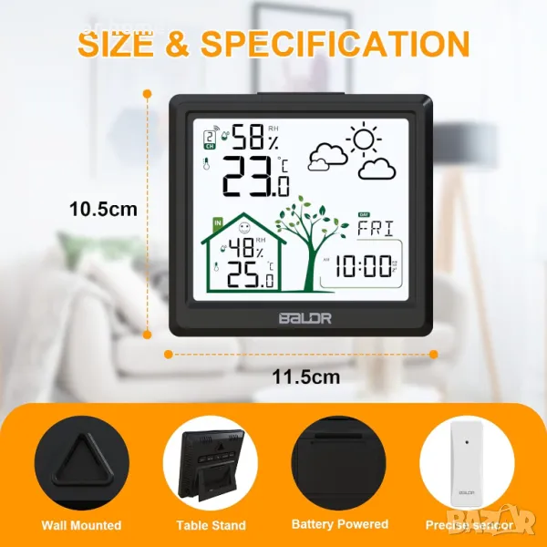 10 секунди бърза реакция и висока точност: дисплеят за температура и влажност актуализира данните на всеки 10 секунди с висока чувствителност и отзивчив дисплей. Най-високата точност се постига чрез изключително стабилен термисторен сензор и подобрени вентилационни ленти на станцията и външния сензор за по-широк диапазон на откриване.