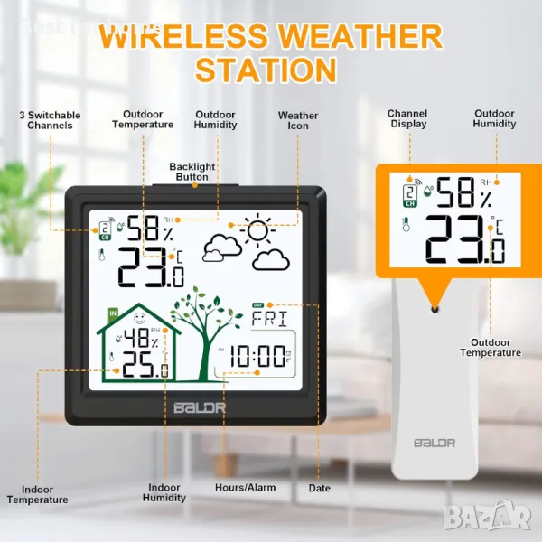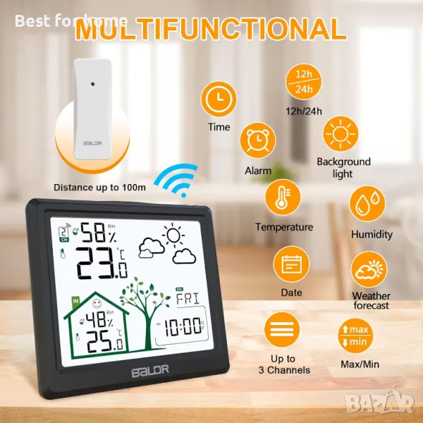 Поддържа до 3 външни предавателя: безжична метеорологична станция с външен сензор има подобрени сензори за по-бързо и по-последователно приемане на сигнала, обхват на предаване без бариери до 100 m. Осигурява точни показания за вътрешна/външна температура и влажност, както и дневни минимални/максимални стойности. Цифровата метеорологична станция поддържа до 3 сензора (пакетът съдържа само един), което я прави идеална за наблюдение на външна температура и влажност на няколко места.