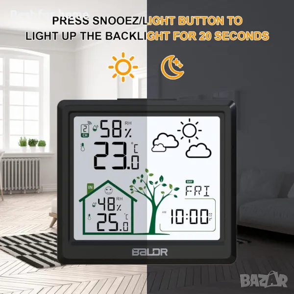 Будилник, прогноза за времето и съвети за комфорт: метеорологичната станция с външен сензор ви предлага персонализирана прогноза за времето за следващите 12 до 24 часа. Устройството разполага и с индикатор за комфорт (сухо/комфортно/влажно), така че можете бързо да идентифицирате условията на въздуха във вашата стая и да ги коригирате съответно. Будилникът има режим на дрямка. След като включите будилника, щракнете върху бутона за отлагане, за да получите 5 минути допълнително време за сън.