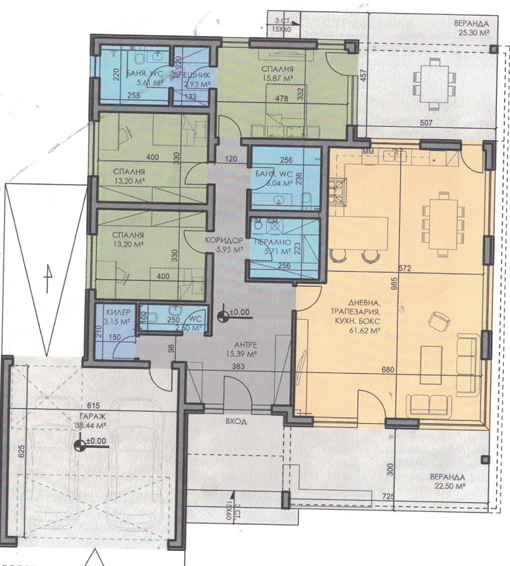 веранди с площи -25,30 кв.м. и 22,50 кв.м, дрешник, перално помещение, две бани с тоалетна, отделно още едно санитарно помещение, килер, просторно входно антре и гараж с топла връзка.
