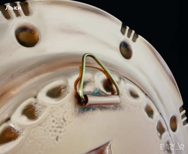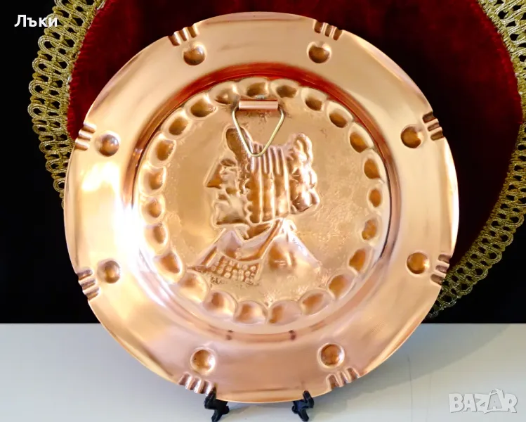 необикновен майстор художник от свръх качествена чиста червена мед,масивна и блестяща.Периферията е декорирана с релефно ковани орнаменти,а крайчето е елегантно заоблено.Даже окачалките са направени с мисъл да бъдат здрави и удобни за закачане. Диаметър 24 см.,височина 2 см.,тегло 270 гр.