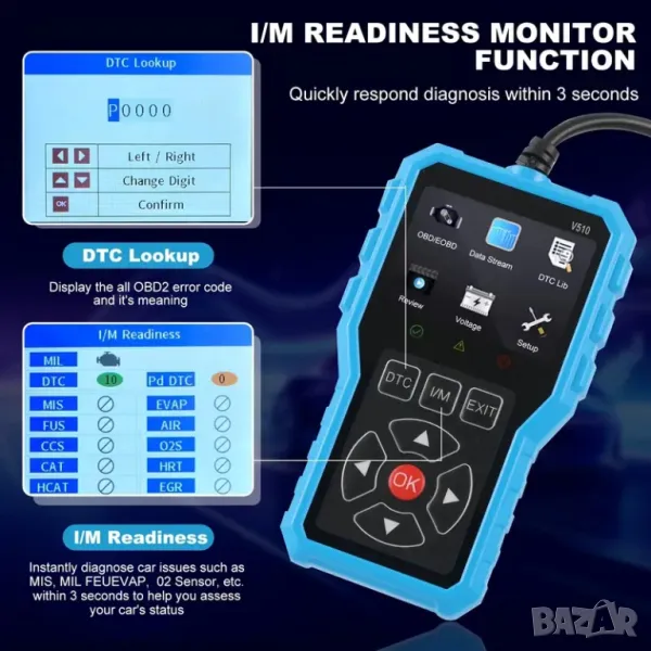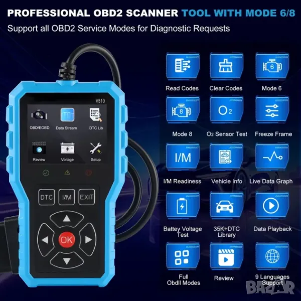 Последната версия на OBD2 диагностичния скенер Э510 за 2025 г. предлага пълни функции на OBDII, режими 6/8, четене на кодове на двигателя, актуални данни, тестване на напрежението на батерията и възможности за ресет, съвместим с всички OBDII/EOBD превозни средства, произведени след 1996 г.