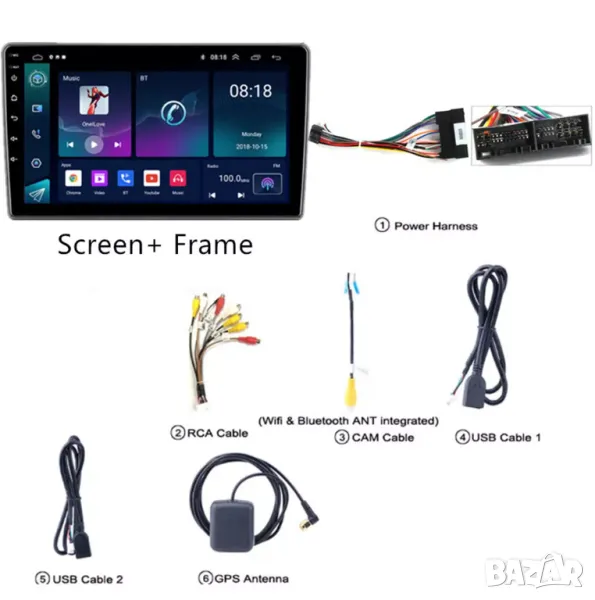 Пълен комплект с цялата рамка, преходни кабели и букси, декодери, предназначени и съвместими за монтиране на конкретния модел автомобил.