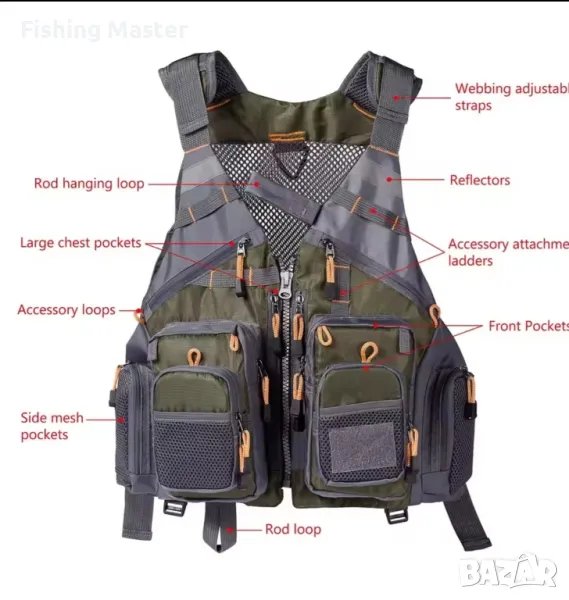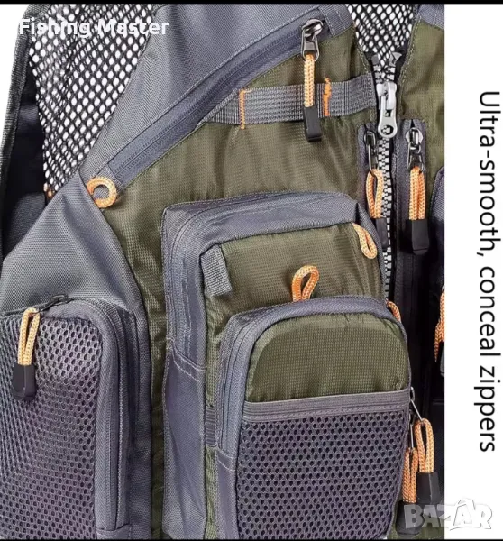 Риболовен елек с множество джобове,има общо 18 джоба (включително 14 джоба с цип с елегантни скрити ципове) със специални дизайнерски характеристики за всичко - от кутии за мухи до термометри.