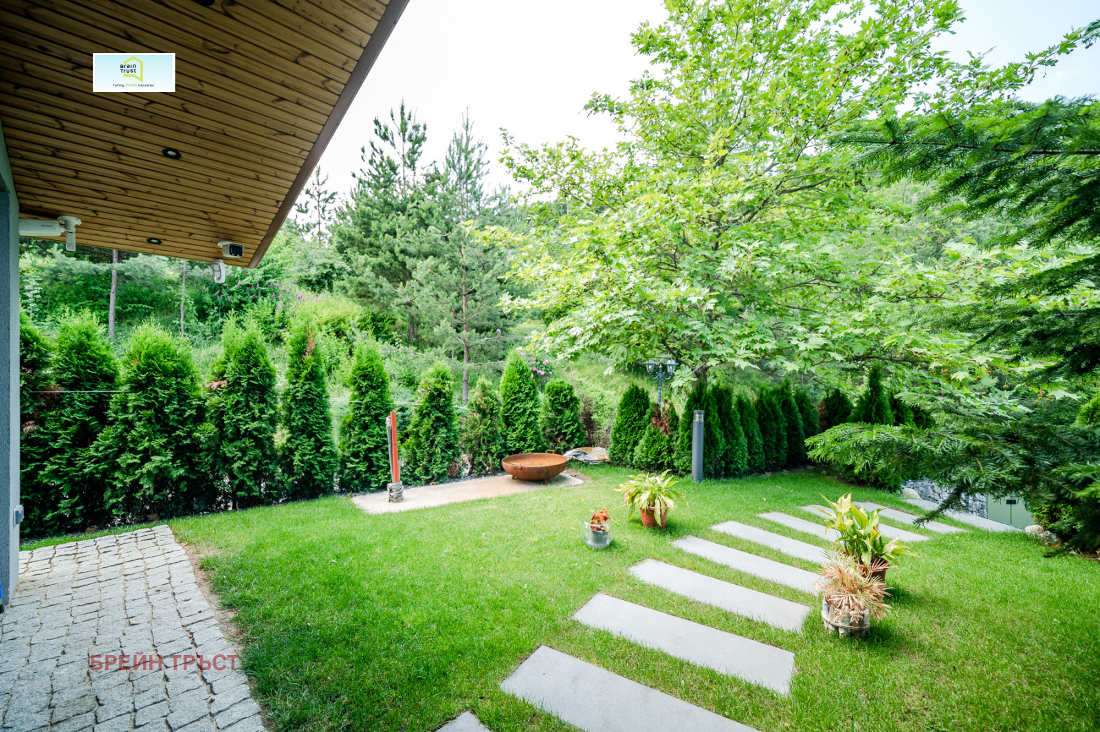 озеленен двор, оборудван с напоителна система;