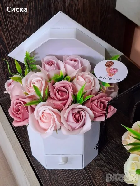 Минавам да покажа още един нов модел който си го поръча една дама⚘️Кутиите шапка с чекмедже за бижу или паричен превод за абитуриенти/абсолвенти⚘️⚘️⚘️ Изработени са от сапунени рози от пластичен сапун и в средата по един гербер за разкош ⚘️⚘️ ✅️Височина 30 см.