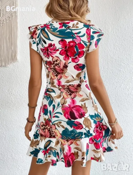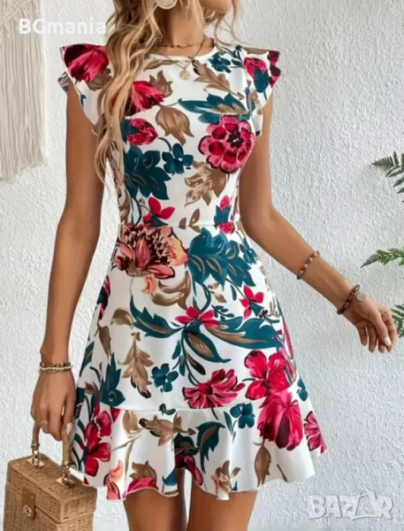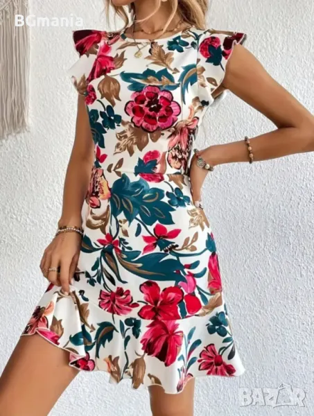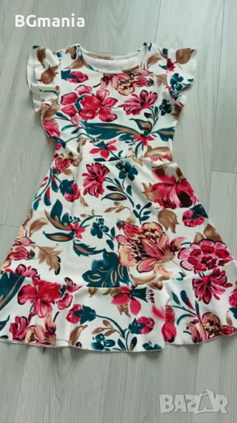 Еластична свободна рокля в бяло на цветя с паднал ръкав размер Л, материя полиестер