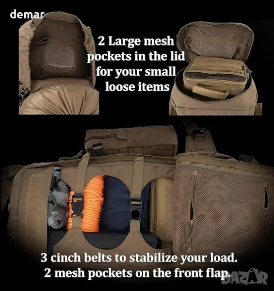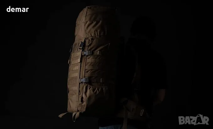 Изработена от здрав, устойчив на износване и вода полиестер със здрави ципове и катарами, тази голяма тактическа раница е създадена за тежки условия. Тя предлага просторно 60-литрово основно отделение с вътрешни ципове, достъп за зареждане отгоре и отпред и множество мрежести джобове за организирано опаковане. Здравата MOLLE система позволява разширяване на екипировката, а функции като отвори за хидратационни тръби, джобове за бутилки с вода, компресионни ремъци и отвори за оттичане добавят гъвкавост. Комфортът е приоритетен с подплатен с пяна, регулируем презрамков колан, подвижен подплатен колан за ханша с MOLLE система, ремъци за повдигане на товара и стабилизатор, както и лумбална подложка. Подсилена дръжка за захващане, два практични джоба, дъждобран, чанта за съхранение, държачи за ремъци и примки за ледоруб допълват дизайна.