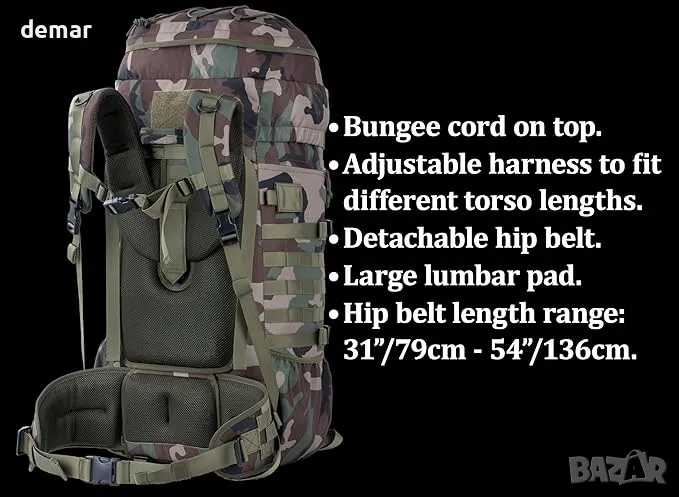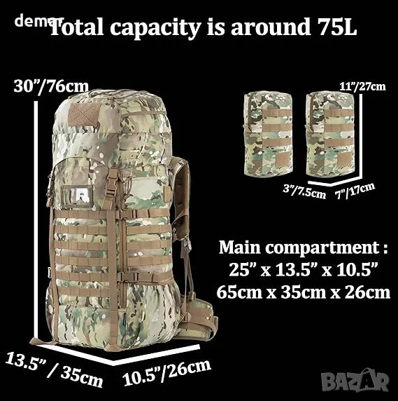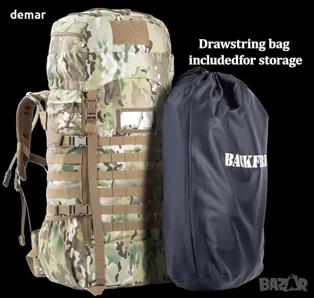 75 литра тактическа раница с вътрешна рамка, MOLLE и хидратираща система за къмпинг, лов, туризъм