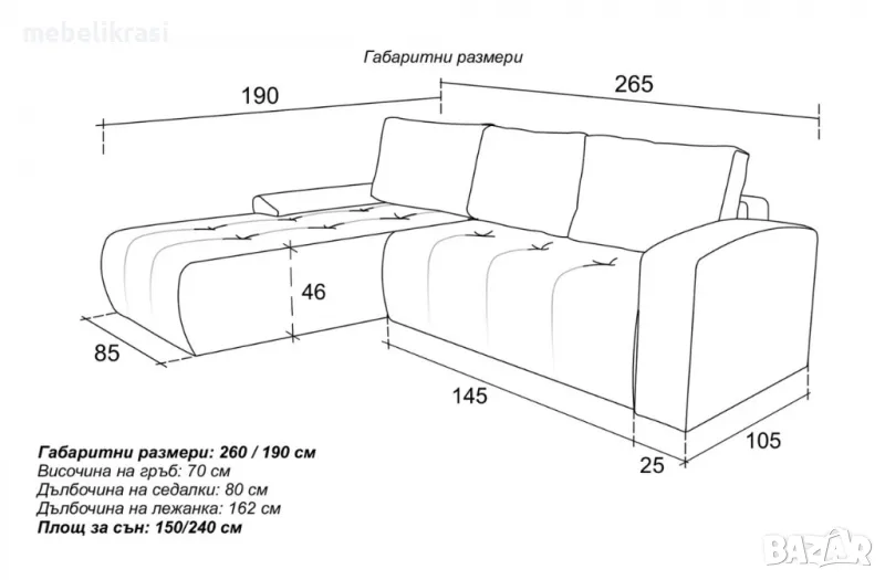 Размери (Д/Ш/В): 260/190/70 см