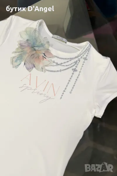 Топ в бяло с 3D дизайнерската пролетна, флорална скица. Тениската е от любимата Ви еластична, стегната материя с полиестерен състав, която не претърпява промени след многократно носене. Втален силует. Къс, кокетен ръкав. Принт колие.