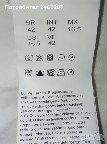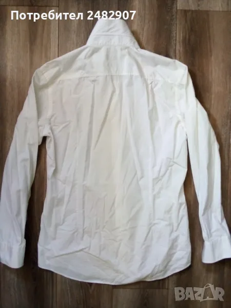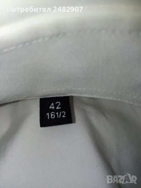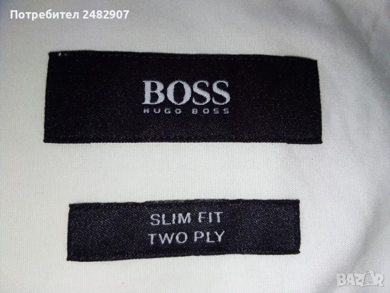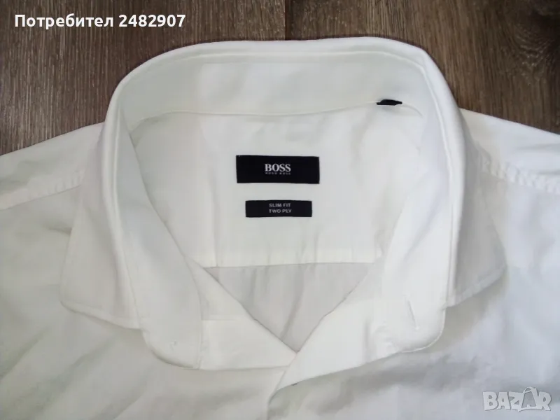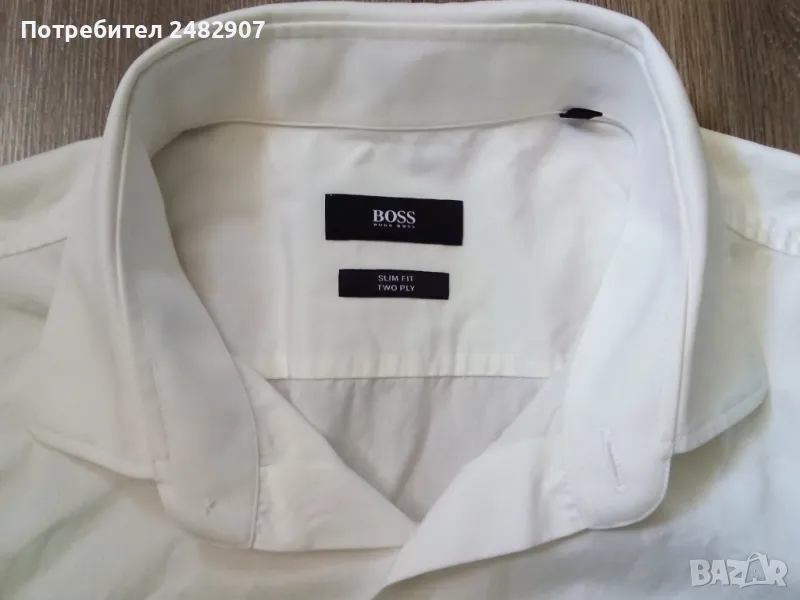 Оригинална бяла мъжка риза BOSS, размер 42. Съдържа 100 % памук. Ширина в раменете - 47 см, ширина под мишниците - 56 см, ширина в долната част - 56 см, дължина от рамото до долу - 78 см, дължина на ръкава от рамото - 66 см, ширина на ръкава в долната част - 11 см. Много запазена, обличана е два пъти за повод, без забележки.